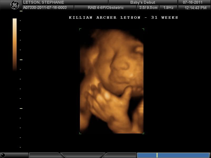 For my birthday, Dad agreed to pay for an elective 4D ultrasound for me so I could see and watch Killian for awhile, so we went on July 16th (almost 32 weeks) and boy was it amazing!!! I got a dvd of the whole thing and a cd with 74 pictures of him. He is still definitely a little boy, and he is a cuddler!! He was all cuddled up with the wall of my uterus, and then when we got him to move, he cuddled with my placenta. :) But we caught a smile and quite a few other faces. He is soooo cute!!!